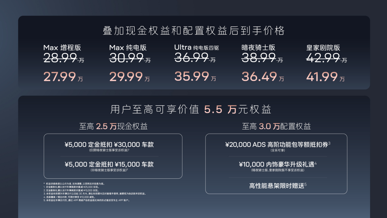 与此同时,针对本次阿维塔11焕新上市,阿维塔还推出了重磅购车礼遇,至高价值55000元。包括5000元定金抵扣15000-30000元车款、20000元ADS高阶功能包等额抵扣券、10000元内饰豪华升级礼遇以及高性能悬架限时赠送。此外,还可享五大基础权益:5年或12万公里整车质保、8年或16万公里三电质保、整车质保期内不限里程免费道路救援、赠送车联网基础流量和每月10G座舱娱乐流量、赠送ADS进阶功能包。