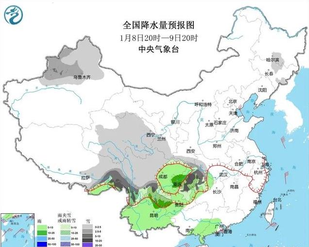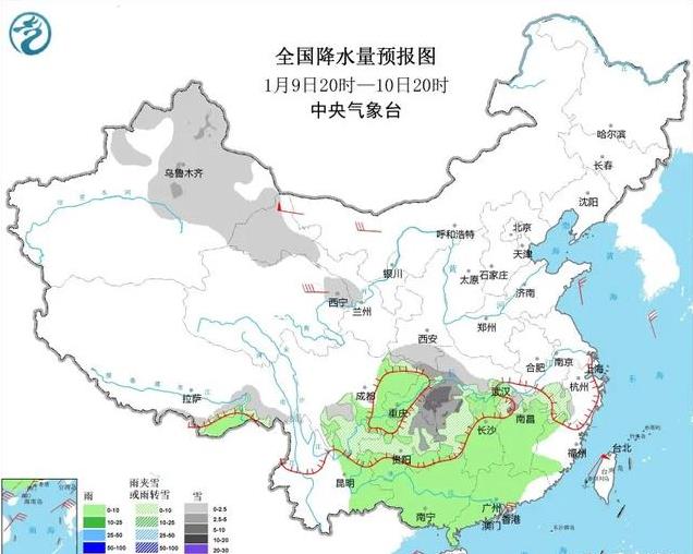 在1月7-9日,西南地区、江汉、江南等地部分地区有小到中雨,贵州、湖北、湖南高海拔地区以及西藏东部、川西高原、云南西北部等地有小到中雪或雨夹雪,这就是基本情况。