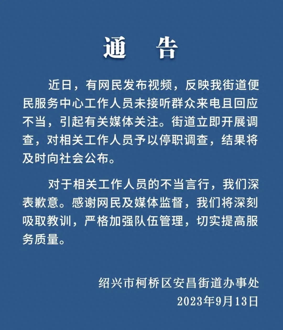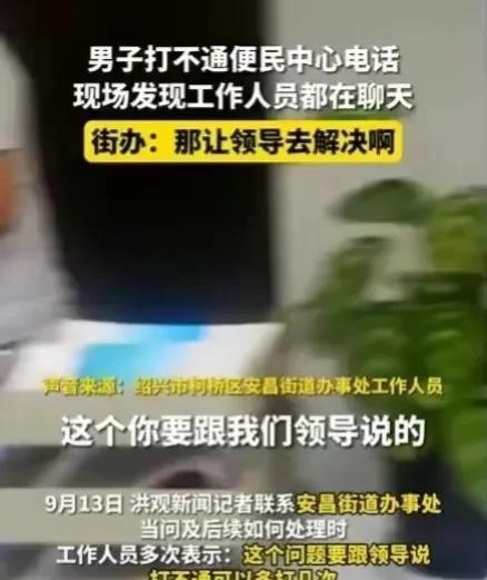 9月13日,浙江绍兴一男子给街道办事处打数十通电话无人接后,直接跑到街道办,甚至在那里又打了一通电话,只听电话声响,只见工作人员全在闲聊,却不见有人来接听便民热线。