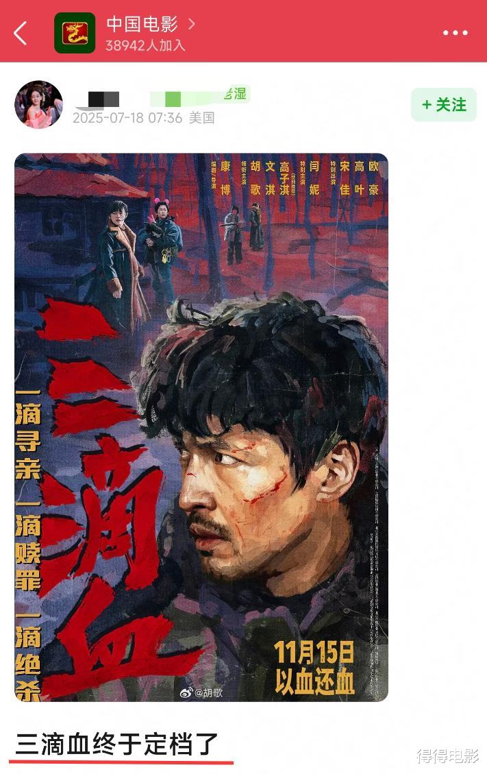 11月15日,胡歌主演的电影《三滴血》终于上映了。