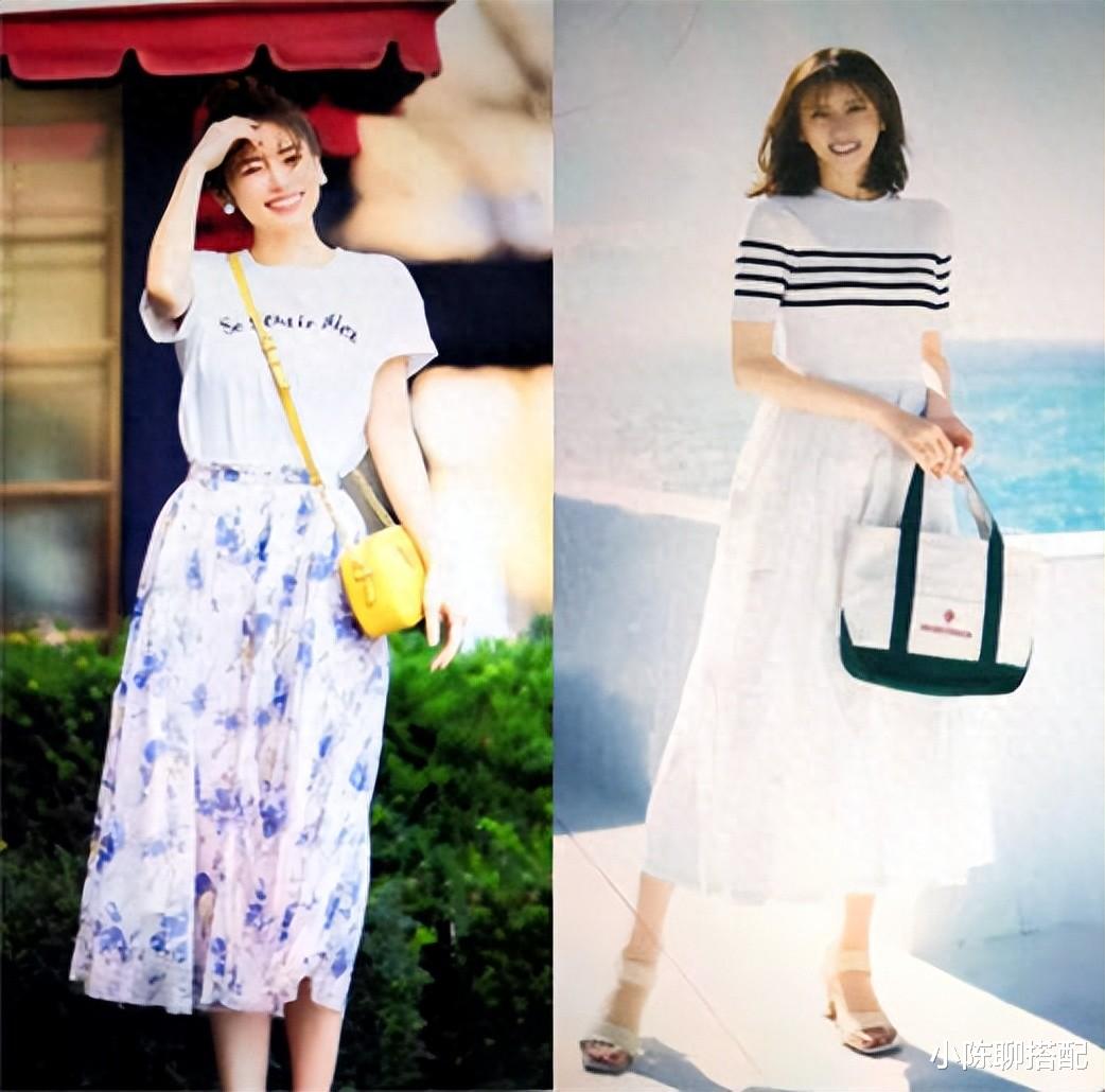 比如:白色T恤+高腰米色A字长裙。好像夏日里的一缕清风拂过,让人觉得凉快,又可以有减龄效果,非常迷人又漂亮。