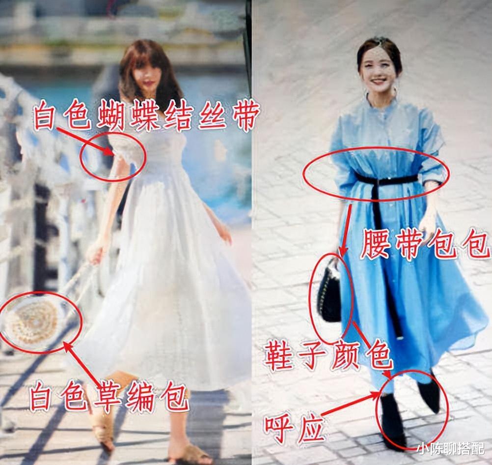 不仅如此,同色呼应还能够让穿搭有纵向延伸感。比如:白色蝴蝶结丝带+白色草编包,或黑色抽绳腰带+黑色手提包+黑色尖头靴。