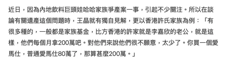 王晶提及李嘉欣夫妇每月从家族基金会中能拿200万的生活费,并不是去爆料,他最初提及的是宗馥莉家族争产这件事,这才由此延伸出家族遗产这个话题,结果就以李嘉欣的家翁许世勋家族为例子。王晶称家族资产的管理形式有多种,一般都是以家族基金为主,比如许晋亨的家族就是以家族基金的方式管理,而李嘉欣夫妇每月能拿200万。对于寻常百姓来说,一个月拿200万的生活费可能就是一辈子的积蓄,不过在豪门中,这200万每个月的生活费,也不是什么钱。王晶称李嘉欣夫妇多少是不情愿的,因为太少了,买一个爱马仕包包都要80万,200万还真是不足以为谈。