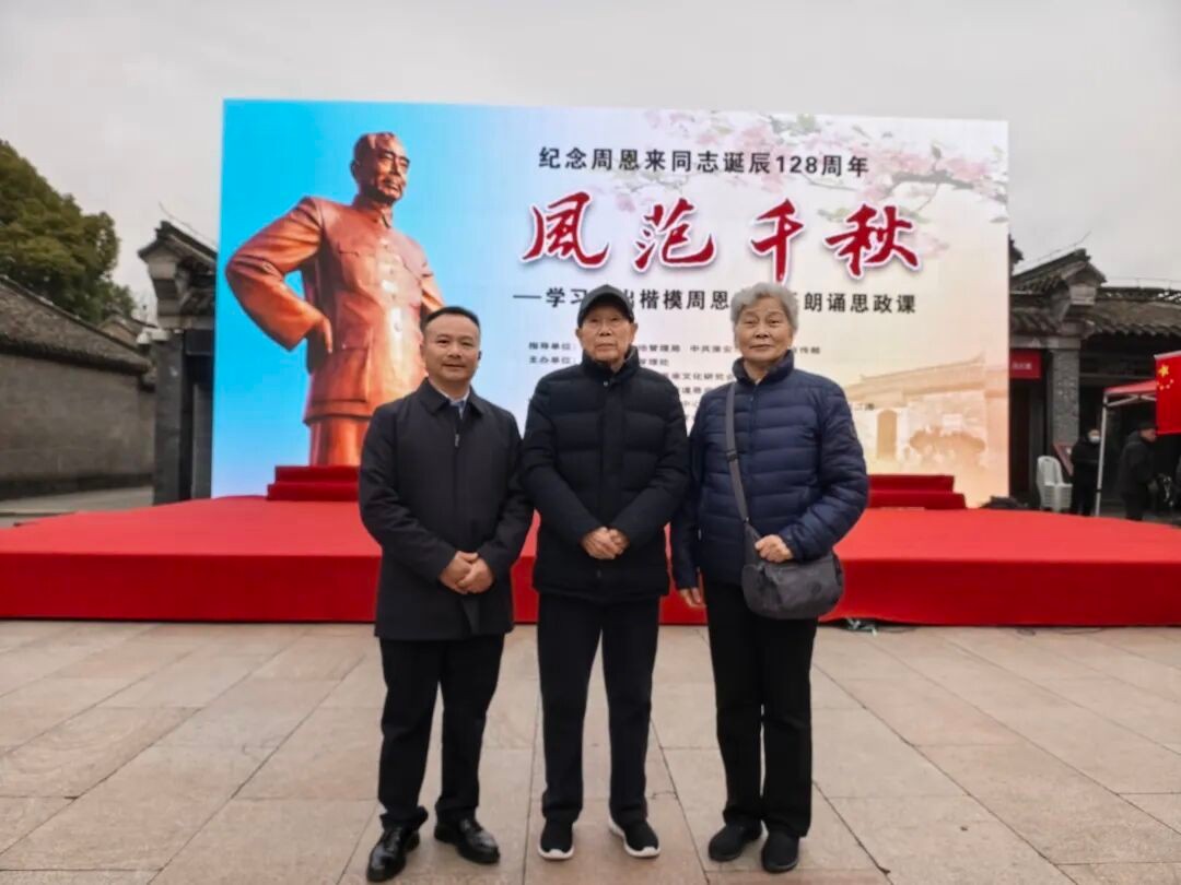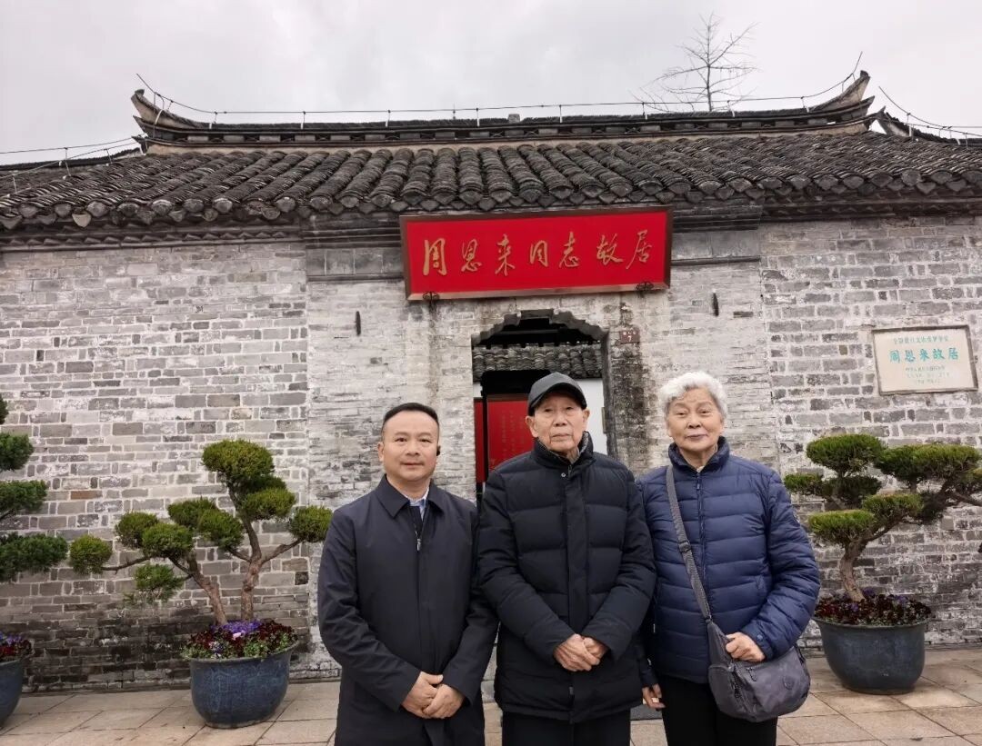 周恩来总理侄子、原广州军区空军参谋长助理周秉钧(中),周秉钧夫人刘军鹰(右),中国萧军研究会副理事长、红色文化委员会副主任、东莞红色文化教育培训基地常务主任韩银山在江苏淮安周恩来同志故居。