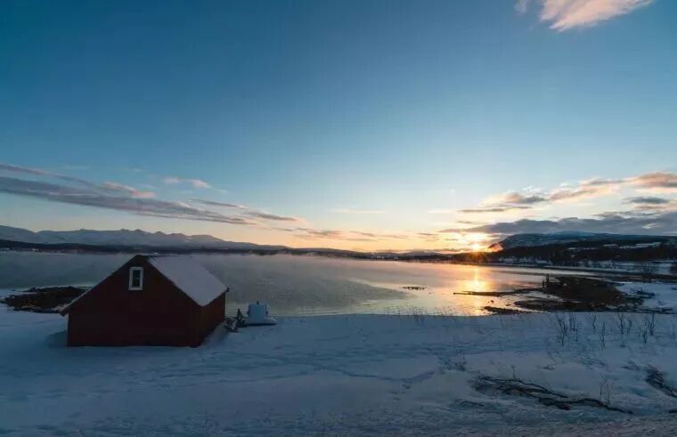 今天前往周边峡湾要游览,深入北极圈城市的角落。重点前往Ersfjordbotn峡湾拍摄,Ersfjordbotn峡湾是特罗姆瑟著名的极光观测点,更是绝佳的拍摄地,因为它有着雪山、峡湾、海水、木屋这样丰富的元素作为极光照的前景,自是比一些只能对着天空拍照的地方好太多太多,但其实,白天的ersfjordbotn峡湾也毫不逊色,有着一种纯净剔透的美丽。那些冰雪覆盖下五颜六色的房子,特别是在晨曦中温暖的灯光未灭之时,活生生一副童话里的场景,那就是想象中,北欧的样子。