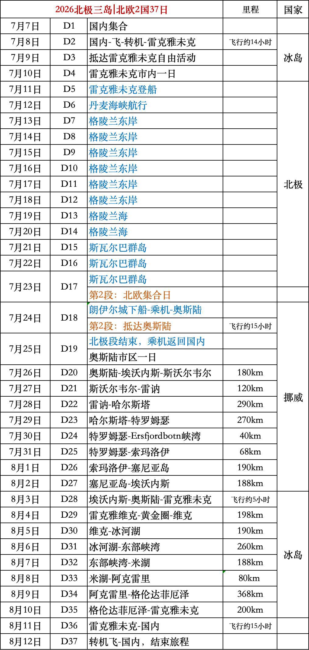 集合日期:第一程(北极三岛国内集结日) 2026年7月7日