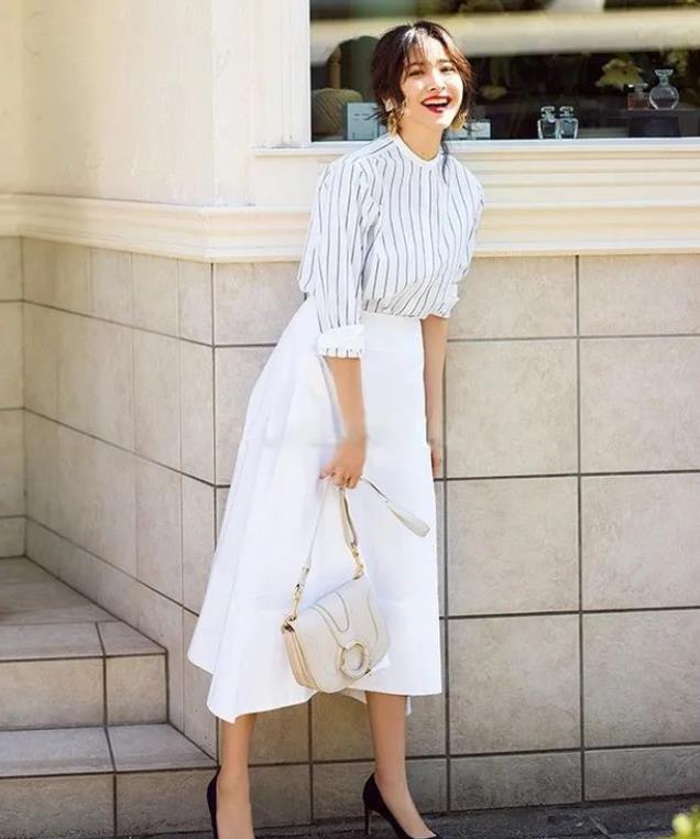 比如选择黑白条纹衬衫搭配白色半身裙,温柔又气质;或者藏青色衬衫配深蓝色裙装,整体造型既优雅又显贵气。