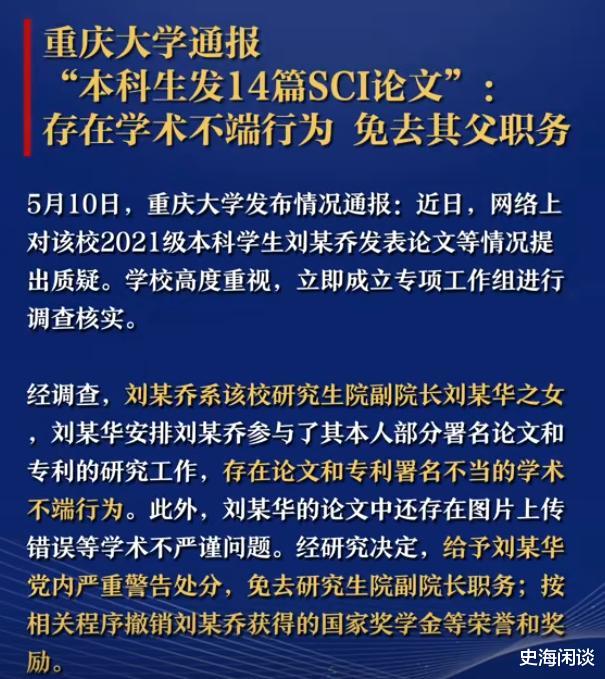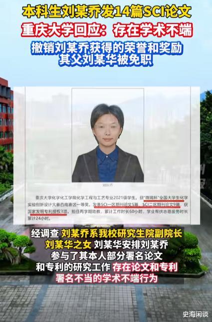 最近,重庆大学的一则通报在网上炸开了锅,2025年5月10日,学校通报称,化学化工学院大四本科生刘某乔因“论文和专利署名不当”,被撤销国家奖学金等荣誉。而她的父亲,重庆大学研究生院副院长刘某华,也因这事儿被免职,还受到党内严重警告处分。