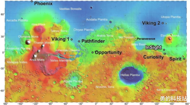 基于火星轨道器激光高度计(MOLA)的火星地形图,显示着陆器位置(改编自NASA/JPL-Caltech图像)。颜色显示海拔,从深蓝色(−8000米)到棕色(12,000米)。图片来源:空间研究进展(2026年)