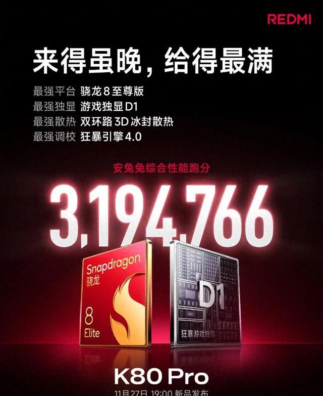 有许多手机牌子,不是电池容量大就是充电功率小,有的充电功率大但无线充功率又小,还有的有120W快充却又不上无线充。K80pro的骁龙8至尊版芯片,安兔兔综合跑分有319万。这K80系列还整得挺有意思,玩了一个谐音梗,弄一个狂暴辣椒酱礼盒套装,预示着K80性能狂暴辣!