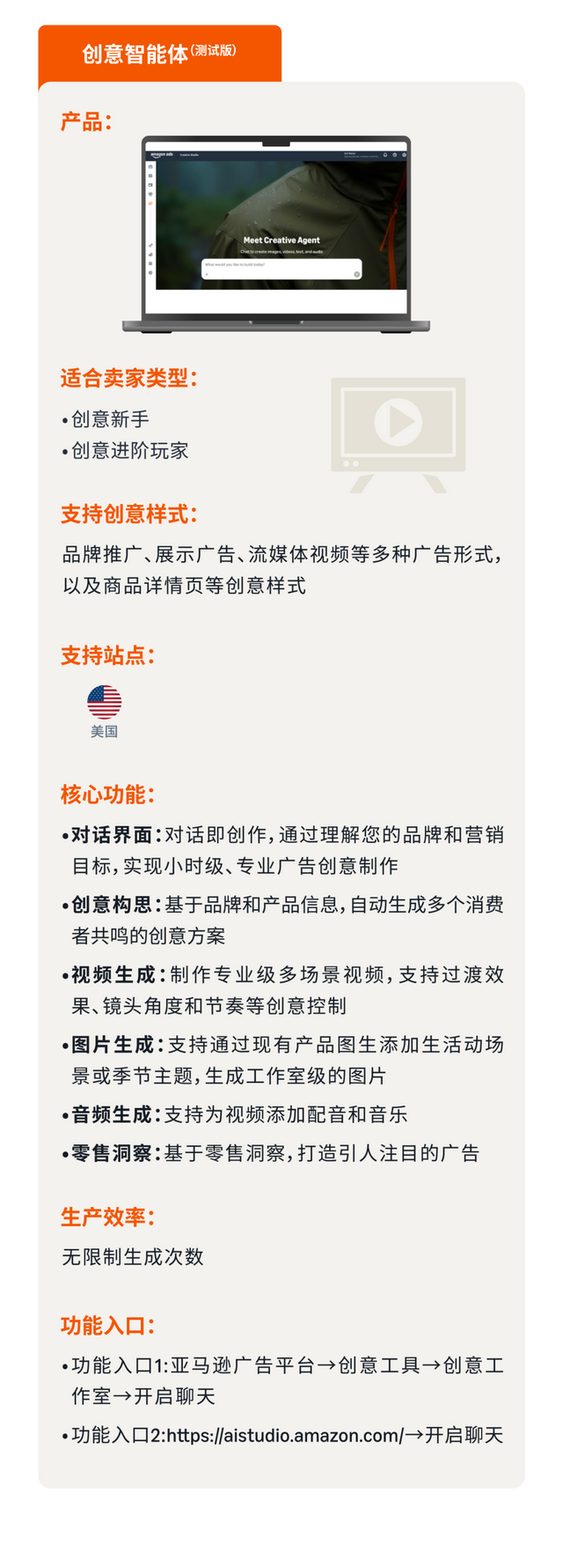 去年亚马逊推出的创意工作室(Creative Studio)已经对卖家的广告创意制作产生了重大的影响。现在,亚马逊重磅上线AI创意工具:创意智能体(测试版)。