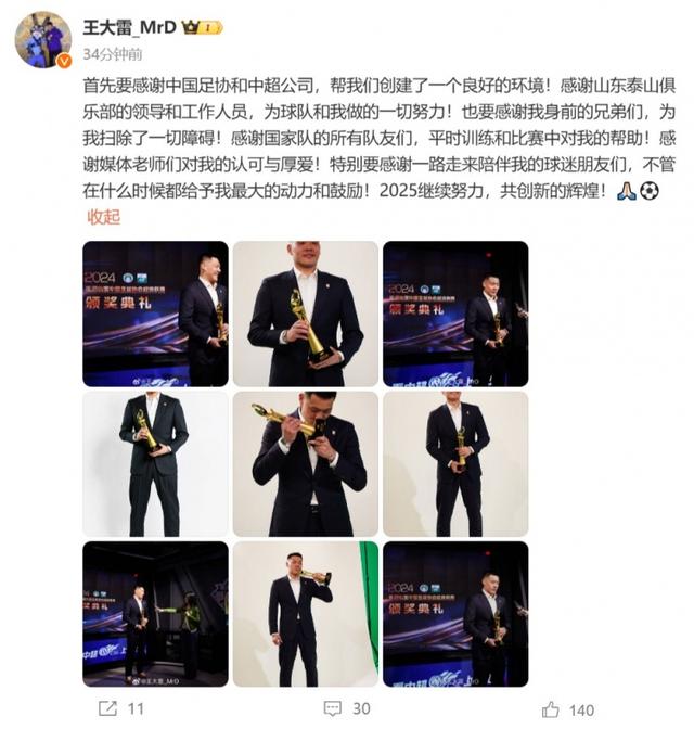 在个人微博,王大雷写道:“首先要感谢中国足协和中超公司,帮我们创建了一个良好的环境!感谢山东泰山俱乐部的领导和工作人员,为球队和我做的一切努力!也要感谢我身前的兄弟们,为我扫除了一切障碍!感谢国家队的所有队友们,平时训练和比赛中对我的帮助!感谢媒体老师们对我的认可与厚爱!特别要感谢一路走来陪伴我的球迷朋友们,不管在什么时候都给予我最大的动力和鼓励!2025继续努力,共创新的辉煌!🙏🏻⚽️”