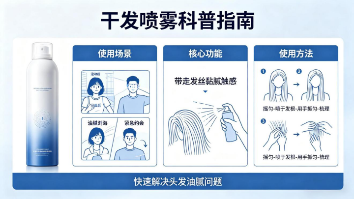 作为一名22岁的早八学生党,兼周末兼职打工人,我真的被油头和赶时间逼疯过。讲真,每天早上能多睡10分钟,比什么都重要,可头发一油就显得邋遢,不打理根本不敢出门。之前买过好几款干发喷雾,踩坑踩得我快放弃——有的操作太复杂,赶早八时根本没时间折腾;有的体积太大,放书包里占地方,通勤携带超不方便;还有的香味刺鼻,喷完被同学问是不是喷了廉价香水,最后全闲置在书桌角落。