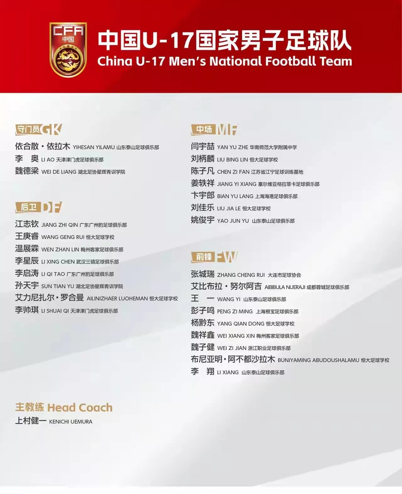 U17国少队由经验丰富的日本教练上村健一挂帅,他为球队注入了新的战术理念和训练方法。上村健一注重技术足球,强调团队配合和快速传切,力图打造一支攻守兼备、充满活力的队伍。队内核心球员艾比布拉已在中超联赛崭露头角,他的技术和意识出众,被誉为未来的国家队10号位。此外,王一、魏祥鑫等年轻球员也展现出不俗的实力,他们将共同为球队的目标而奋斗。