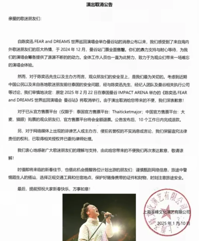 今天,陈奕迅正式宣布取消在泰国曼谷的演唱会,主办方承诺将在10日内全额退票。原因是担心因“王星事件”可能对歌迷安全造成影响。这一举动迅速引发热议,粉丝们纷纷感叹:“Eason不仅颜值与才华兼备,连人品都让人佩服!”