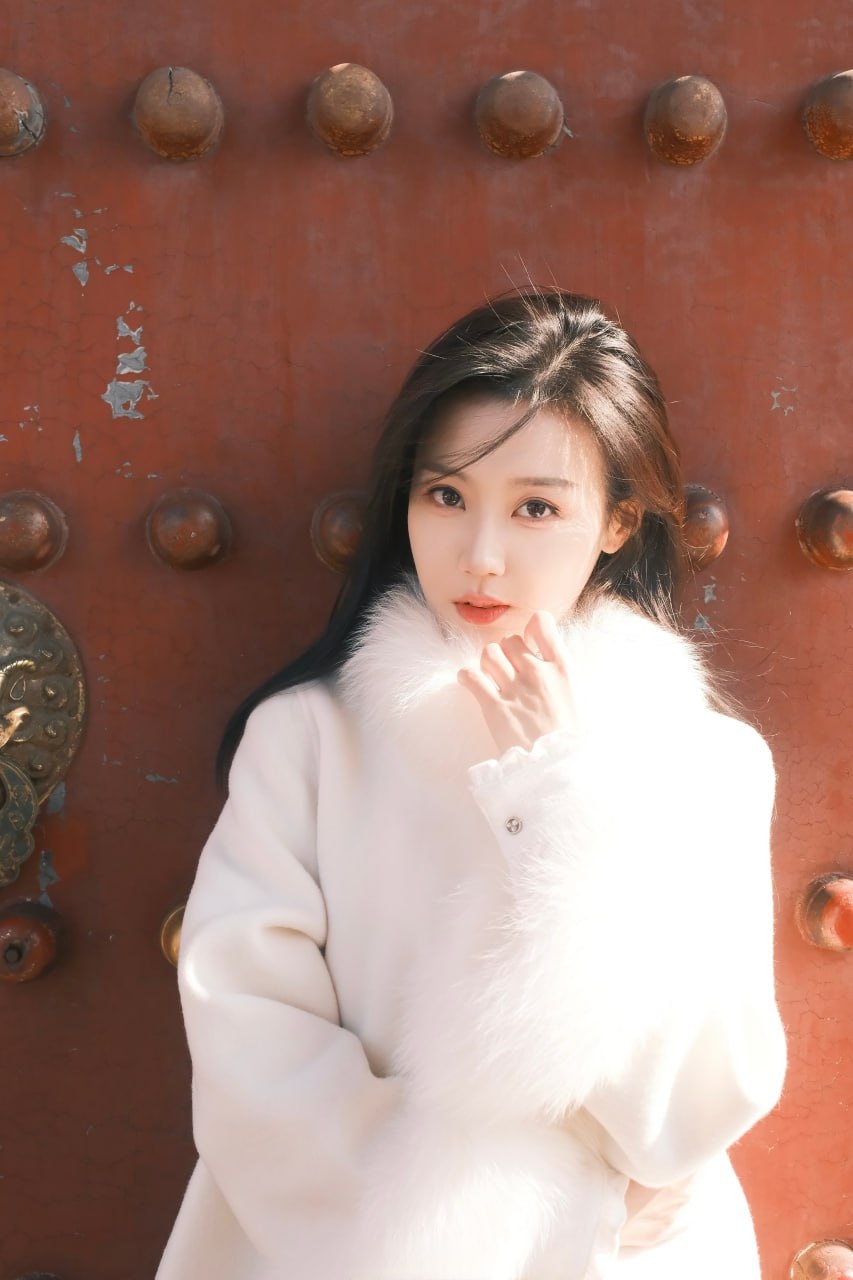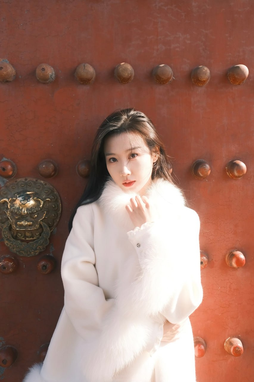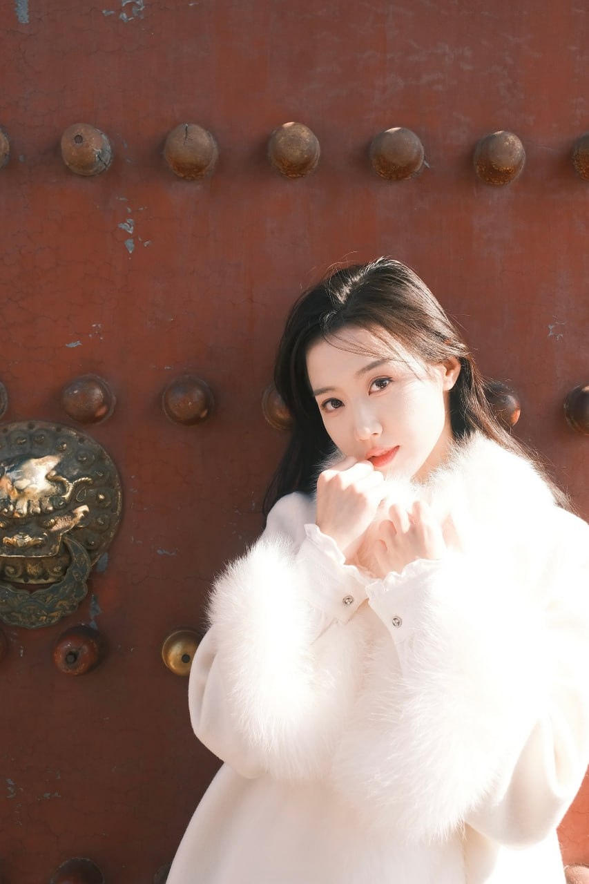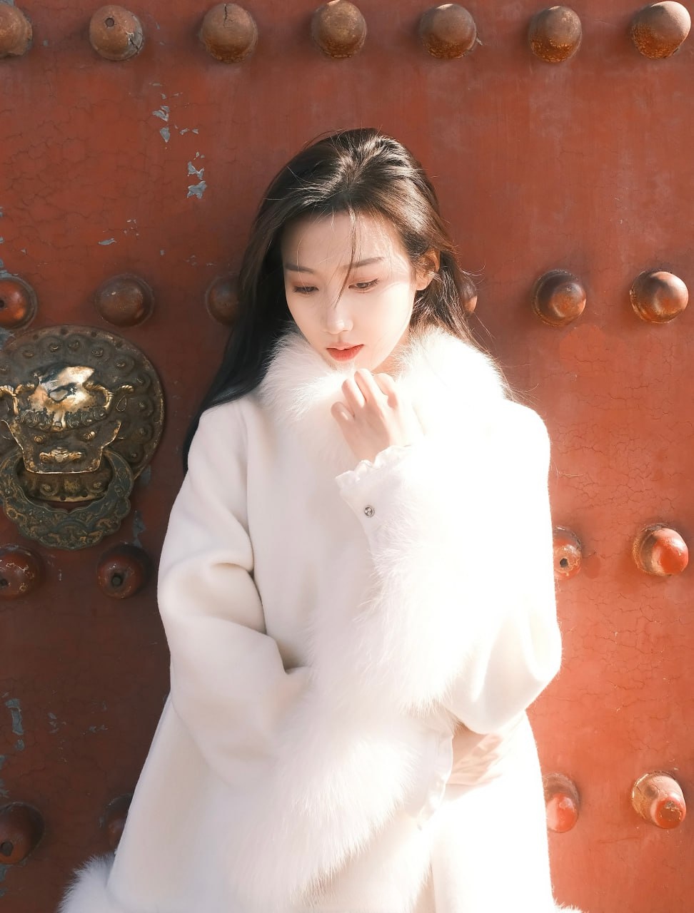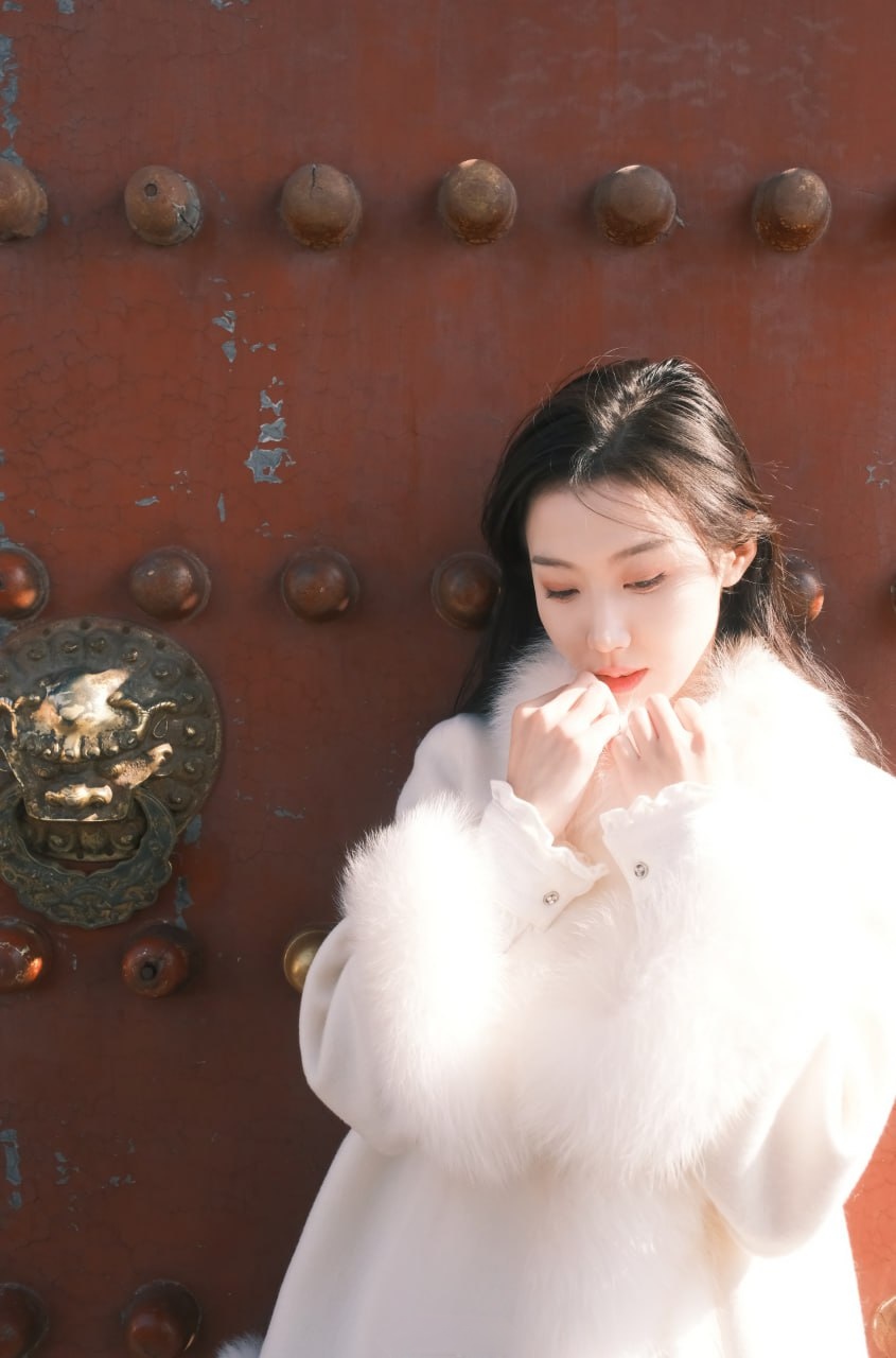 指尖轻抚门环的刹那,时空折叠——古铜兽首门钉与奶油白毛绒外套的碰撞,是千年门第美学与当代松弛感的极致对话。@南潇晴 以一袭垂坠感毛绒外套,在朱红大门前定格东方韵脚:兽首门环的刚劲线条,被柔软绒毛温柔驯服;高领设计裹挟着冬日温度,却让脖颈线条如青花瓷般清冷出尘。