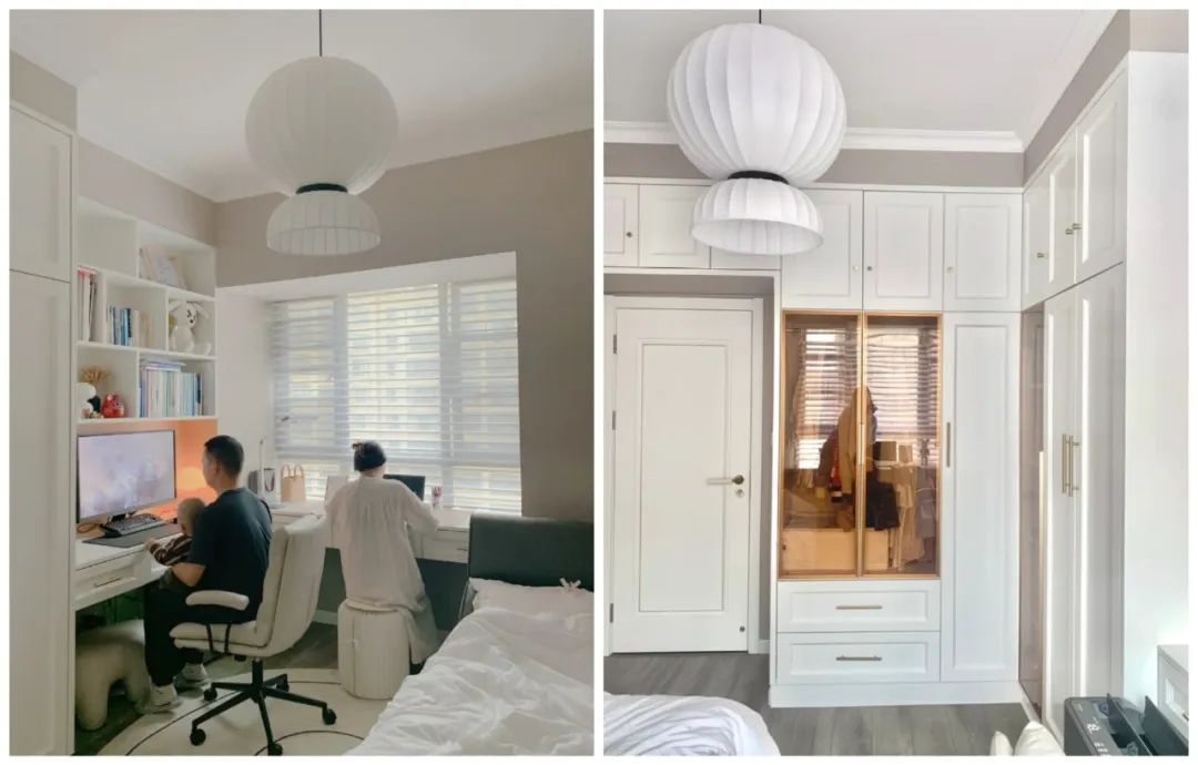 只要打开思路,家里立马就多了个“书房+衣帽间”。一边设计书桌和书架,一边设计满墙衣柜。既满足了两个人办公的需求,又有了超强的储物能力。