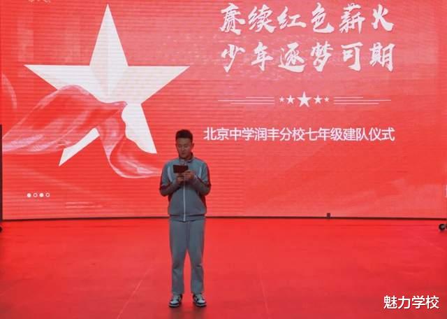为纪念“一二·九”运动九十周年,加强爱国主义教育,做好团队衔接,2025年12月9日下午,北京中学润丰分校在学校剧场隆重举行了“赓续红色薪火 少年逐梦可期”七年级少先队建队仪式。校党总支王雪梅书记、团总支书记陈慧平老师、七年级全体师生共同参与了这一庄严而富有意义的活动。