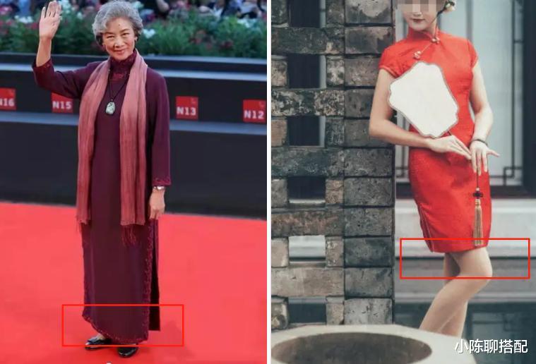 一是显得不够庄重,甚至有点风俗;二是长款旗袍,有垂坠的线条顺着身形下来,能遮住不必要的露肤。这种得体又优雅的美,比短款更有韵味。