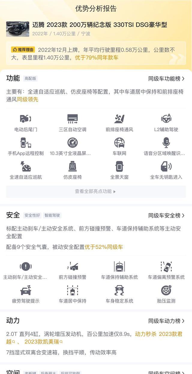 再谈论市场行情,近些年国产车的崛起,以及合资品牌的激烈竞争,已让不少消费者重新审视自己的购车需求。尤其是在二手车市场上,消费者的选择变得更加多元与理性。面对同级别竞争对手,迈腾虽然借助其品牌影响力获得了相当关注,但如何吸引更多潜在客户、保持市场的竞争优势仍需深思熟虑。同时,随着用户对汽车的需求日益多样化,迈腾也需要不断进行迭代与更新,改善自己的短板,以应对未来市场的挑战。