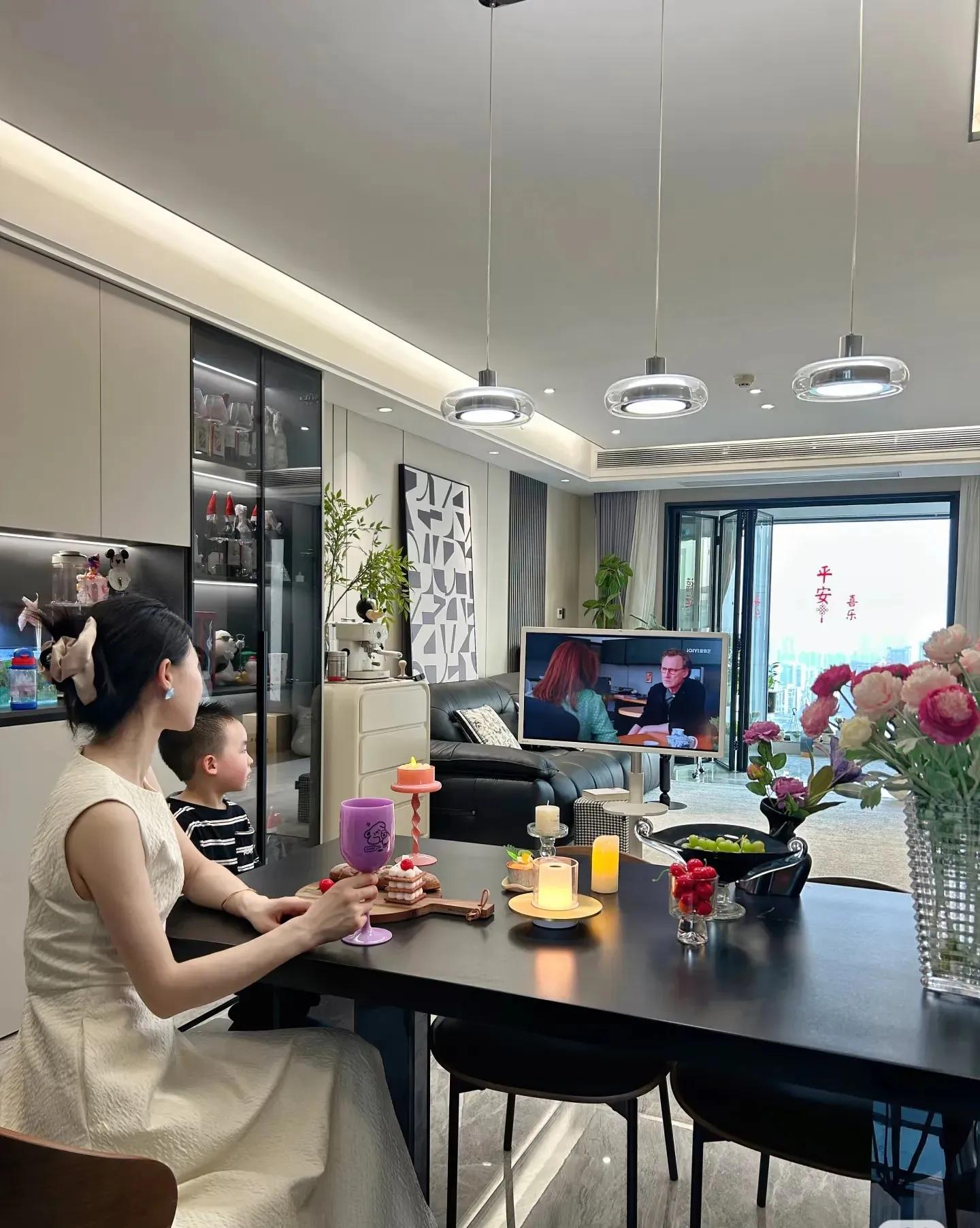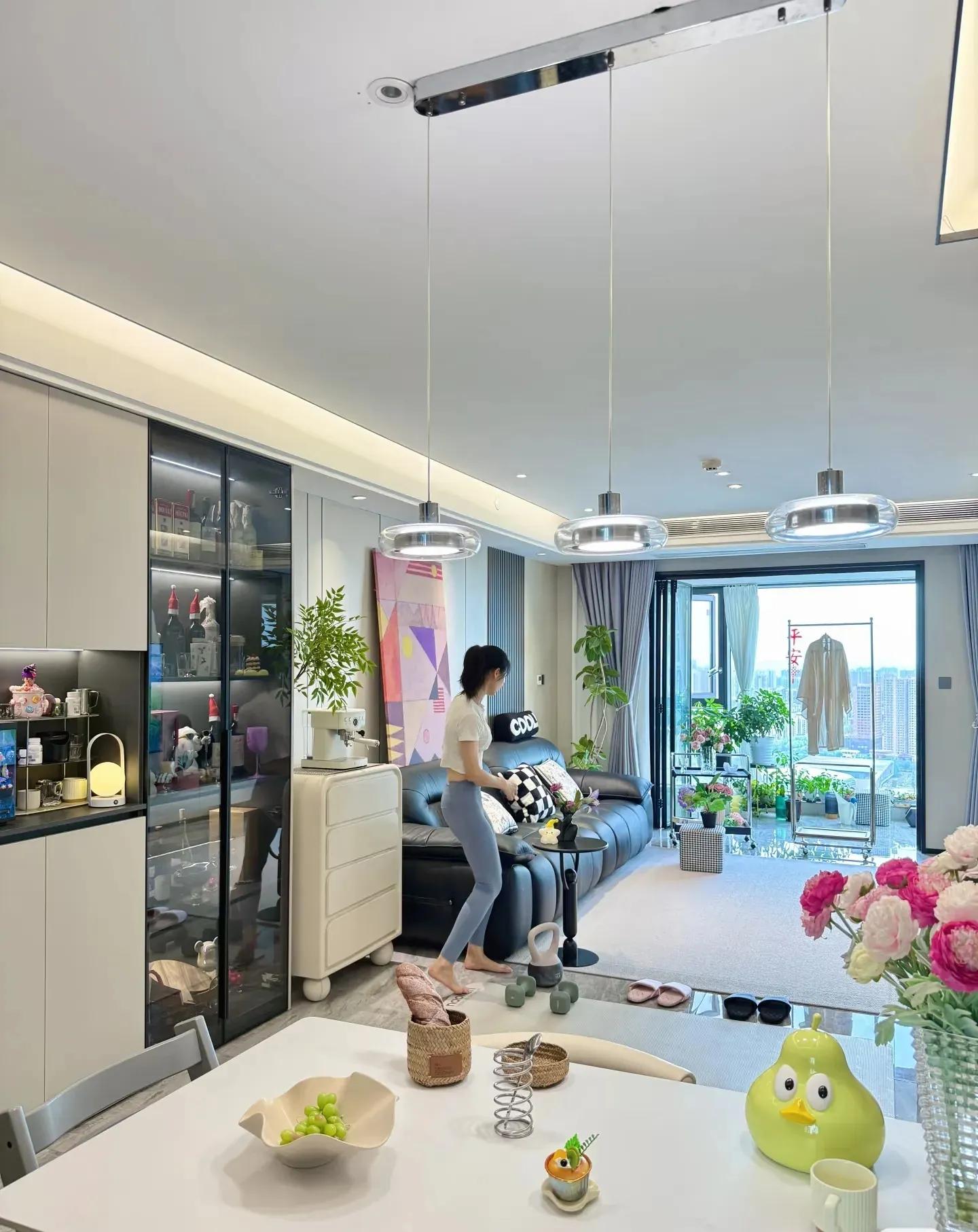 客厅区域做了无主灯,悬浮顶的效果,简洁温馨感爆棚。灯带➕射灯。简单且出效果。