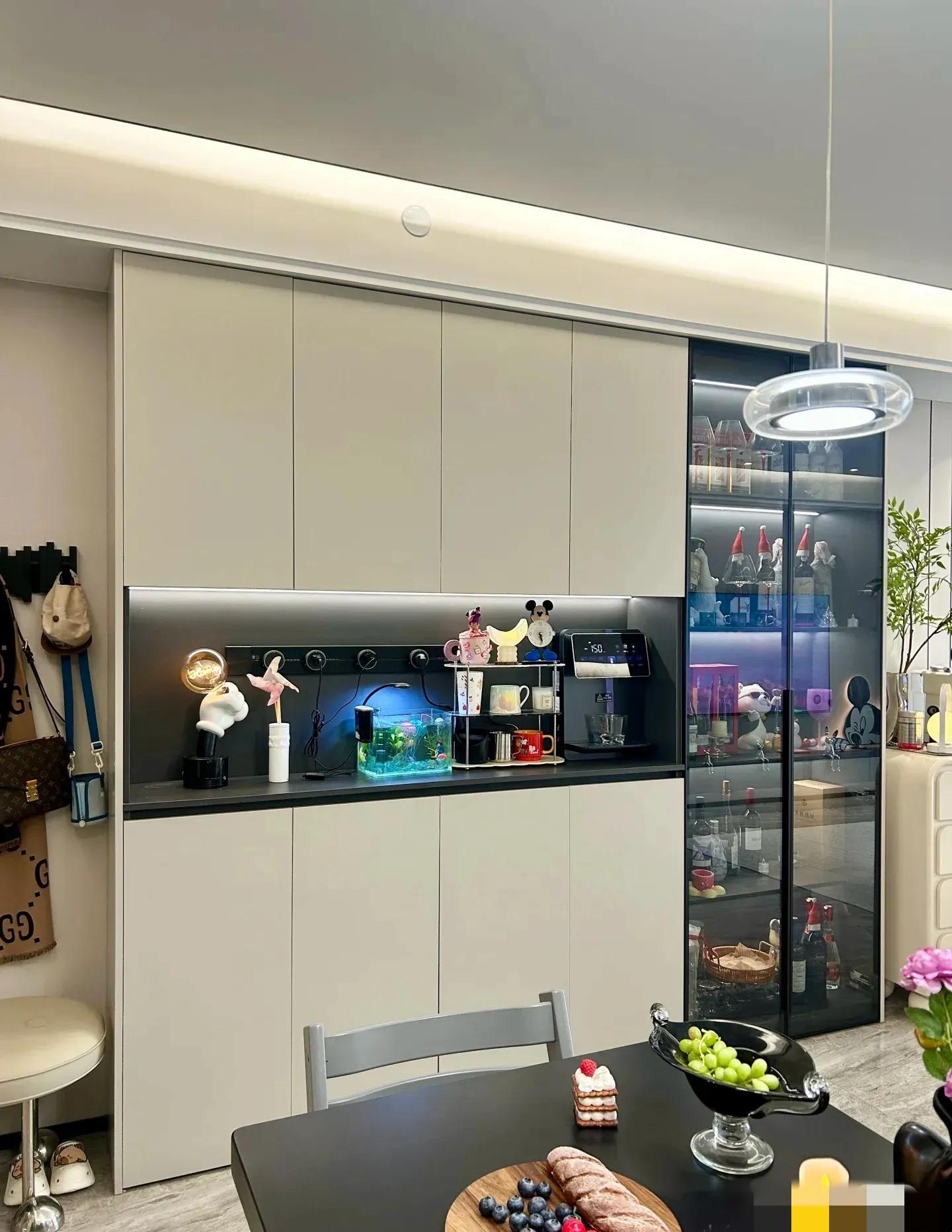 侧面设计一整排餐边柜,真心不错!储物空间扩大不少 。