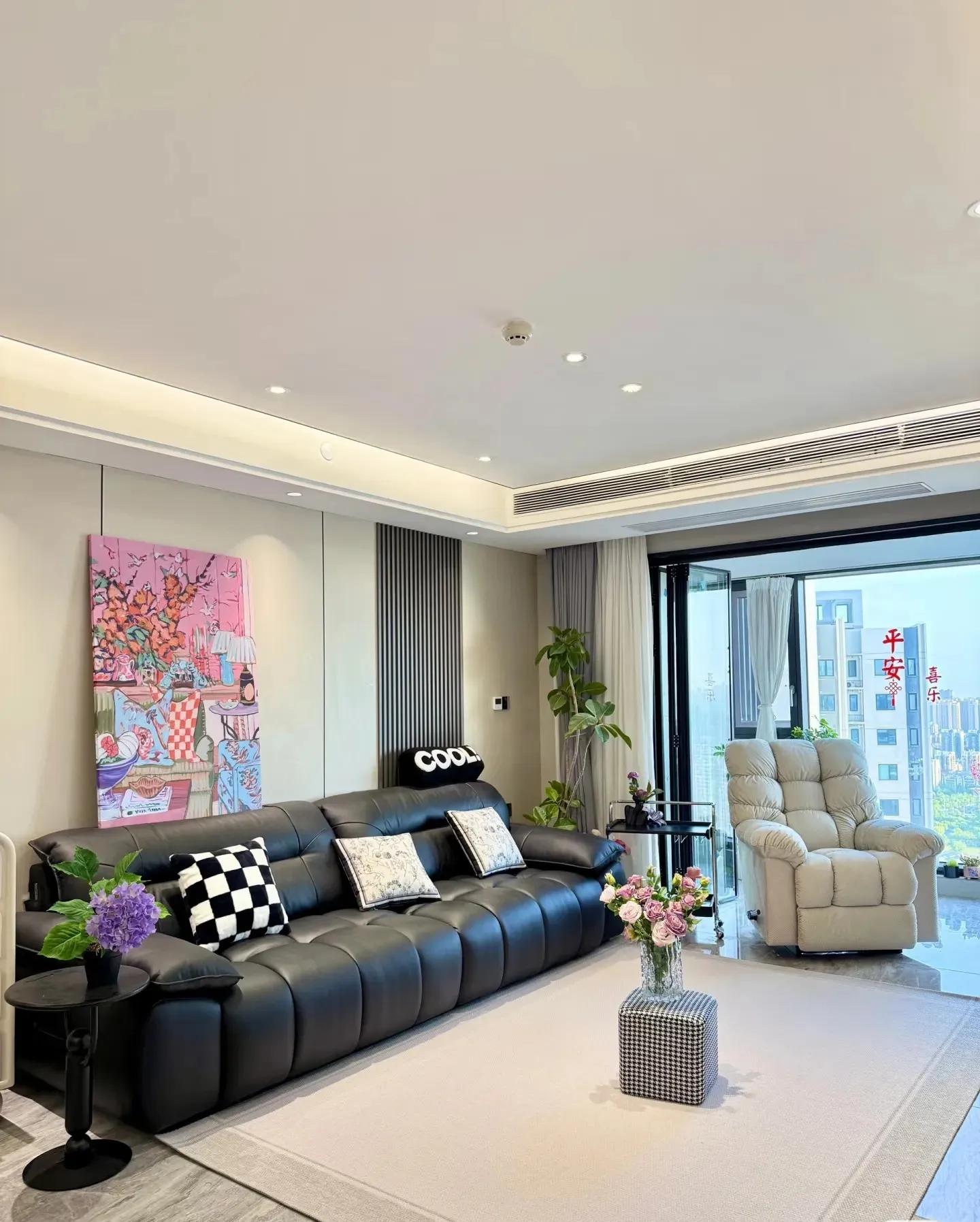 客厅区域家具搭配,皮质直排沙发,搭配浅灰色单人沙发,真心❤️可以,地下灰色地毯。周边搭配绿植。