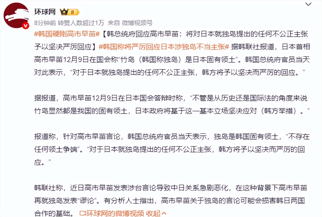 据悉在12月9日当天,高市早苗参加会议的时候竟然公开发言,称“竹岛“,也就是韩国人说的独岛是日本固有领土,大家都知道独岛位置非常重要,该岛位于朝鲜半岛以东,面积大约73平方公里,该岛上大概有一万多人。截止到目前为止,该岛也存在很大的争议,虽然现在由韩国实际控制。韩国还称之为东海,可是日本称之为日本海,不承认是韩国的岛屿。
