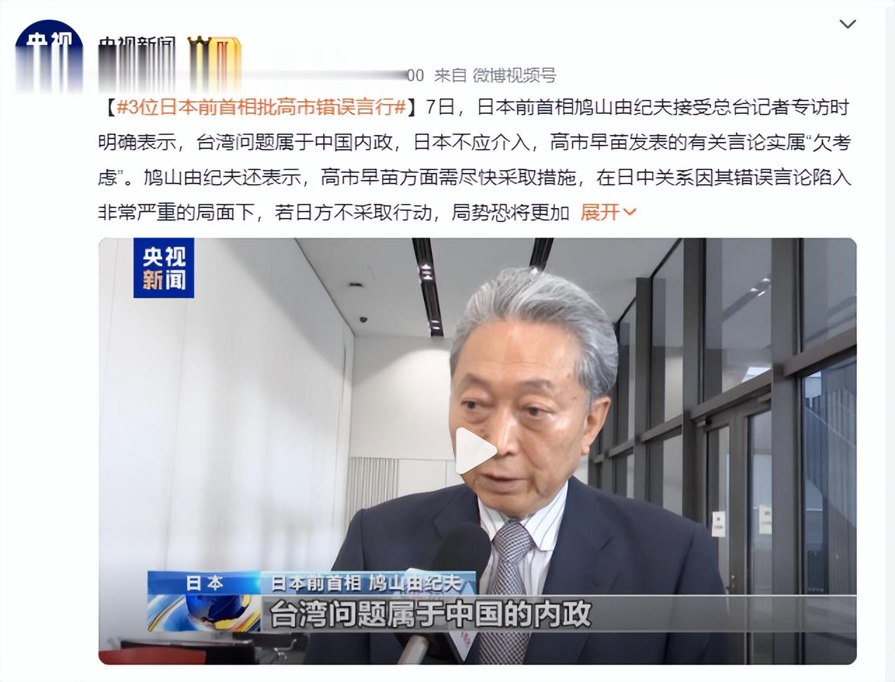可以说现在的高市早苗就像过街老鼠人人喊打,随着多国对高市的怒怼,也凸显了日本与亚洲邻国的历史认知鸿沟持续扩大。其实不仅很多国外谴责高市早苗,就连日本三位前首相也看不惯高市早苗的错误言行,在这么多天内,日本前首相鸠山由纪夫明确表示,台湾就是属于中国内政,日本根本无权过问,除了前首相鸠山由纪夫之外,还有石破茂、野田佳彦也于近期多次批评高市早苗错误言论。