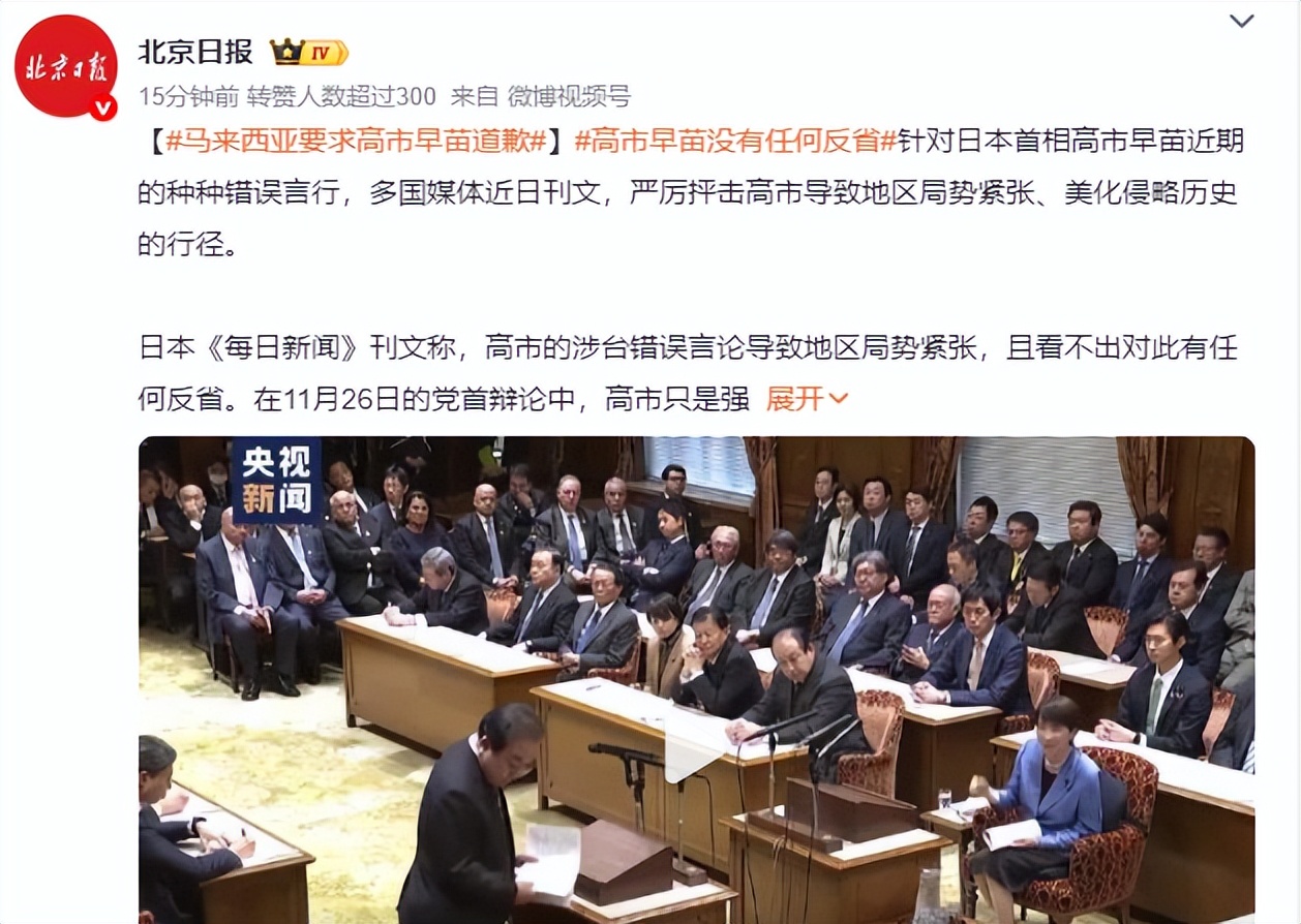 除此之外,马来西亚现在也要求高市早苗道歉,根据国外媒体发文表示,高市早苗曾经在吉隆坡向战死的日军献花,随后引起了马来西亚甚至整个东南亚人民的公愤,让人不敢想象的是,高市早苗不仅没有提到日军的罪行,还企图模糊概念,所以马来西亚人也感觉高市早苗应该公开道歉。截至到12月10日,高市未回应马来西亚诉求,俄罗斯媒体更指出,高市涉台言论及献花事件是日本系统性"修正二战战败史"的战略动作。