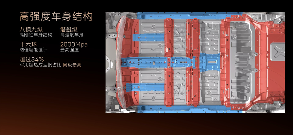 电池安全方面,电芯采用宁德时代AI 加强的第八代智能产线,累计通过150+项专项安全和性能试验,电池0起火0爆炸,达到了极高安全标准。此外,门槛梁采用全贯穿式六宫格铝型材和热成型钢三层外中内板组合设计,形成“三明治”式防护结构,外加热成型双拼座椅后横梁结构,组成三重防护结构,在遭遇冲击时高效保护电池。