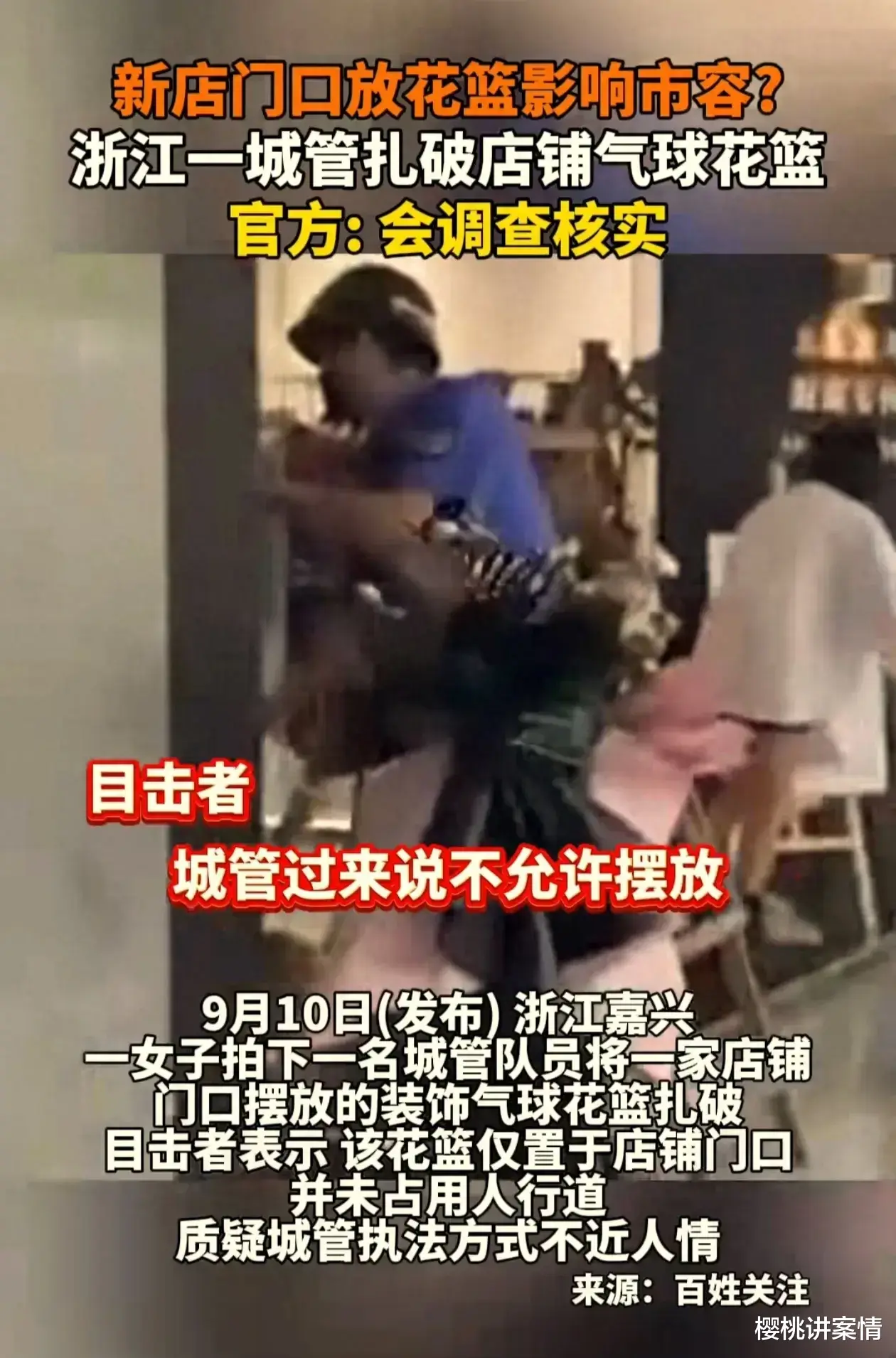 据女子称县城一家花店开业,为了活跃气氛,花店老板摆放几盆花篮和不少气球,并且摆放的花篮气球也并没有占经营,但却遭受到两名城管的暴力执法,他们恶意的用剪刀等手段,将花篮中的气球通通扎烂。
