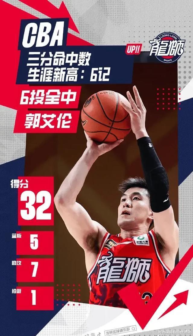 这场比赛,郭艾伦和36岁的联盟“得分王”琼斯展开了精彩对攻。琼斯打了34分钟,得到34分8篮板6助攻;郭艾伦打了31分钟,有32分5篮板7助攻进账。31岁的郭艾伦在这场比赛中简直神了,进攻的时候,外面能投三分,里面能突破,简直打疯了!防守上也特别拼,抢下了5个篮板。在串联球队方面,他送出了7次助攻。这一场打下来,郭艾伦得分是全队最高的,正负值+24也是全队最高的,投进了6个三分,是全队最多的,三分命中率也是全队最高的。