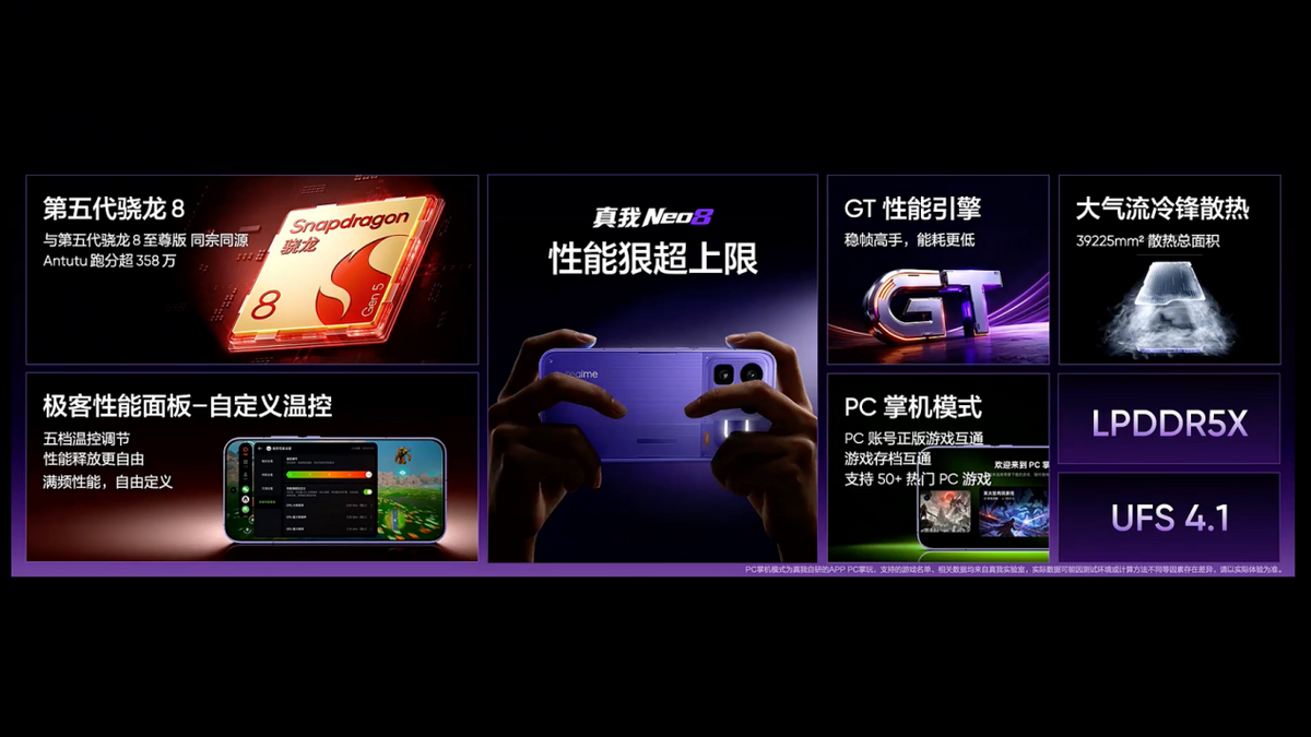 核心配置上,真我Neo8搭载了第五代骁龙8旗舰芯和LPDDR5X内促+UFS 4.1闪存,高达39225mm²的总散热面积,让旗舰进行持续极致释放,畅玩各类大型游戏。同时,真我Neo8还有独家的极客性能面板,支持用户自定义设置性能释放。也同步推出了全新的PC掌玩功能,能够在手机上畅玩PC游戏。还有苍穹信号芯片S1,全面提升网络信号体验,确保用户能够尽情畅快玩个够!