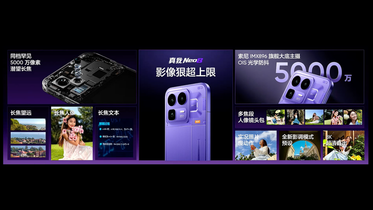 除此之外,真我Neo8还搭载了5000万像素的索尼旗舰大底主摄、5000万像素的前往长焦,支持8K超清直出、AI望远超清、LivePhoto等,让电竞潮玩性的性能旗舰,也有出色的影像体验。