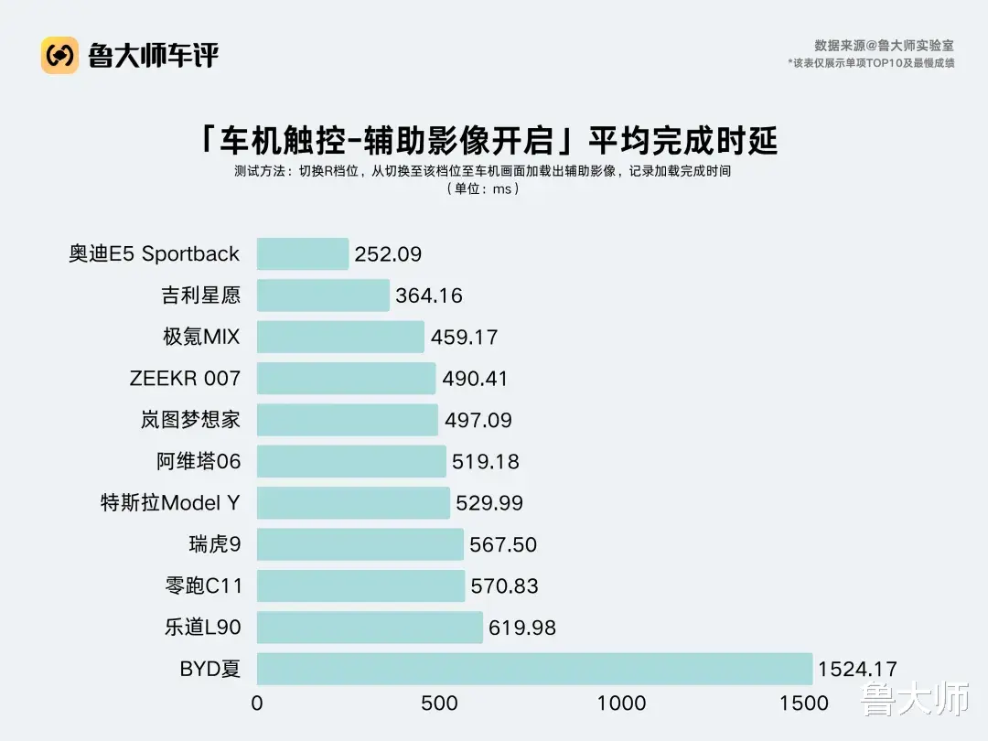 开启辅助影像测试同样表现突出。切换R档位,记录切换行为至车机画面加载出来的辅助影像,E5 Sportback的252.09ms是测试中最快的。