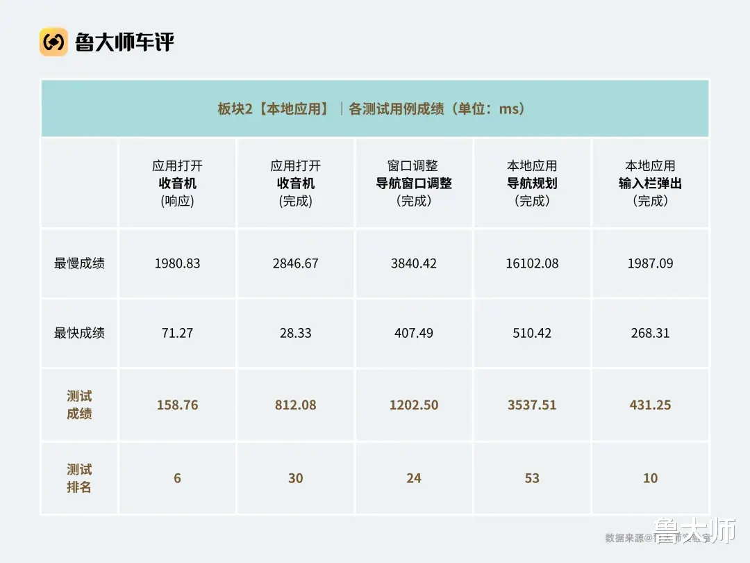 本地应用板块的表现也较为分化。像打开收音机这类轻应用只需158ms,响应迅速;但涉及地图和导航这种对计算、线程调度要求更高的任务时,它的表现明显吃力。导航窗口调整需要1202.5ms,规划路线则达到3537.51ms。