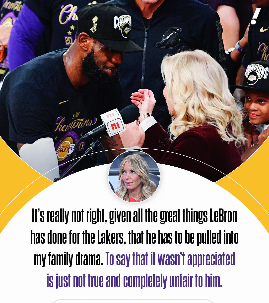 消息一出,风向又变,湖人小老板珍妮马上发声,名记Sam Amick报道她给了声明,意思是老詹为湖人的贡献摆在那,把他卷进家族纠纷不应该,说我们不感激他更离谱,对他很不公平,这么表态,算不算直接打脸爆料方?