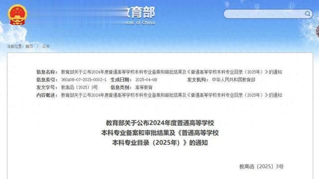 2024年度普通高等学校本科专业备案和审批结果及《普通高等学校本科专业目录(2025年)》可登录教育部网站(http://www.moe.gov.cn)查询。