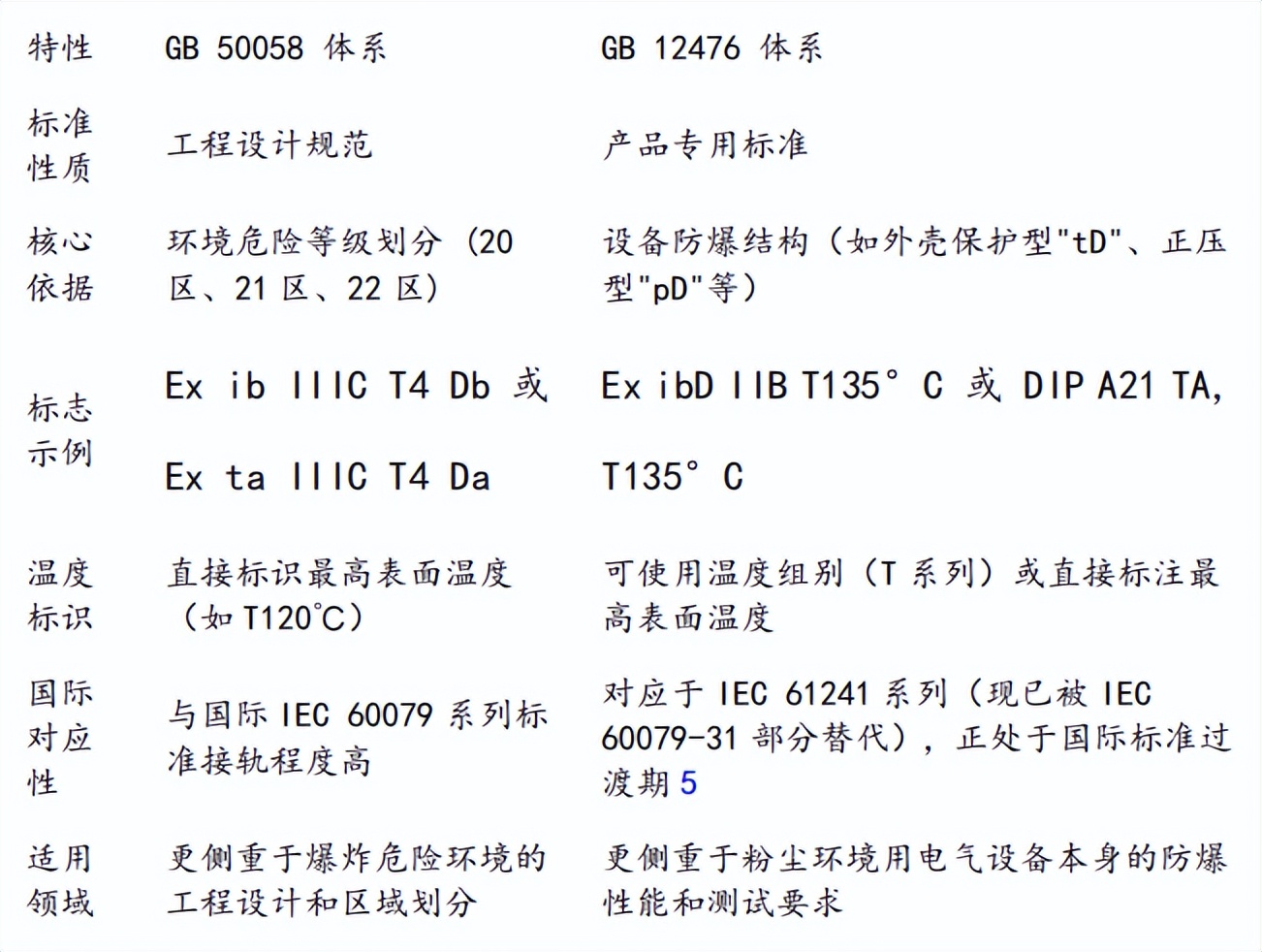 GB 50058 体系更强调设备保护级别(EPL),即 Da、Db、Dc 等级别,这与爆炸危险区域(20区、21区、22区)有直接的对应关系,能更清晰地表明设备适用的安全等级。GB 12476 体系虽然也包含保护级别,但其标志更侧重于传统的防爆结构型式。