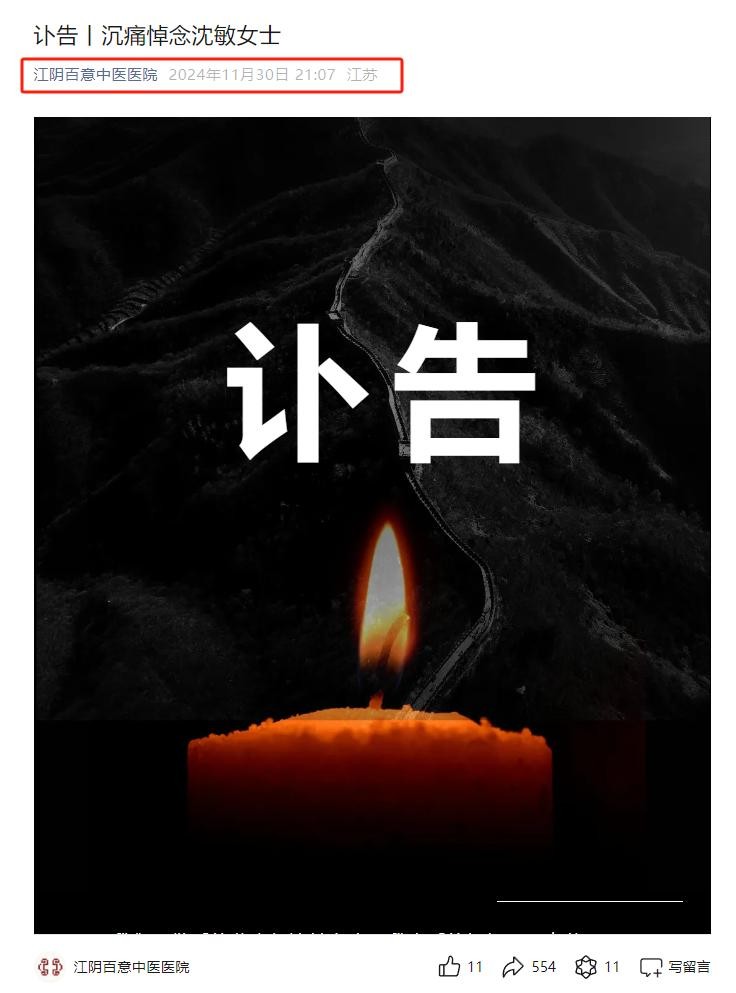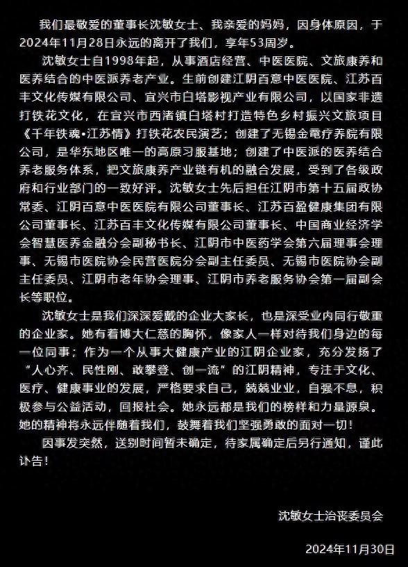 金钱,在很多人的观念里是十分重要的,觉得没钱比死了还难受,可真有了钱却又觉得命重要,2024年11月30日,江阴百意中医院突然发出讣告称53岁沈敏离世,此消息一出瞬间引起人们热议。