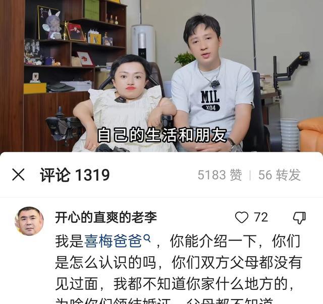 尤其是李喜梅的父亲更是在视频下方直接评论,质问大双两人是怎么认识的,家住哪里,竟然在双方父母不知情的情况下领结婚证。