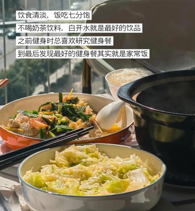 这位潮汕姑娘的饮食也很有节奏,每餐都保持七分饱,并且她认为家常饭比复杂的健身餐更健康、好吃,更能保持自己的身材和健康。