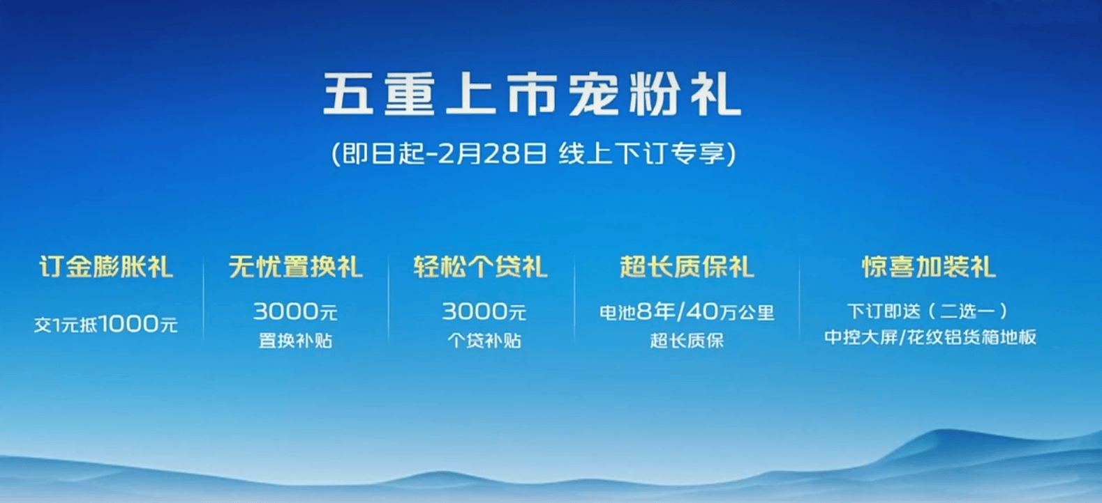 除此之外,即日起,下订还可享受订金膨胀礼、无忧置换礼、轻松个贷礼、超长质保礼、惊喜加装礼共五重上市宠粉礼。