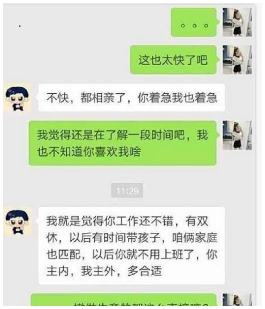 小倩的搞笑聊天记录:哥们的婚宴上,他两个壮得像小牛犊子似的小舅子是这样对他说的:你要是敢欺负我姐,我们哥俩可饶不了你!哥们连忙赔笑:把心放肚子里吧!我绝对不会欺负她!!!第三天新姑爷回门,新娘子一回到家就把俩小舅子给揍了……他不欺负我,你们让他欺负谁去???!!!俩小舅子:姐夫,救我……