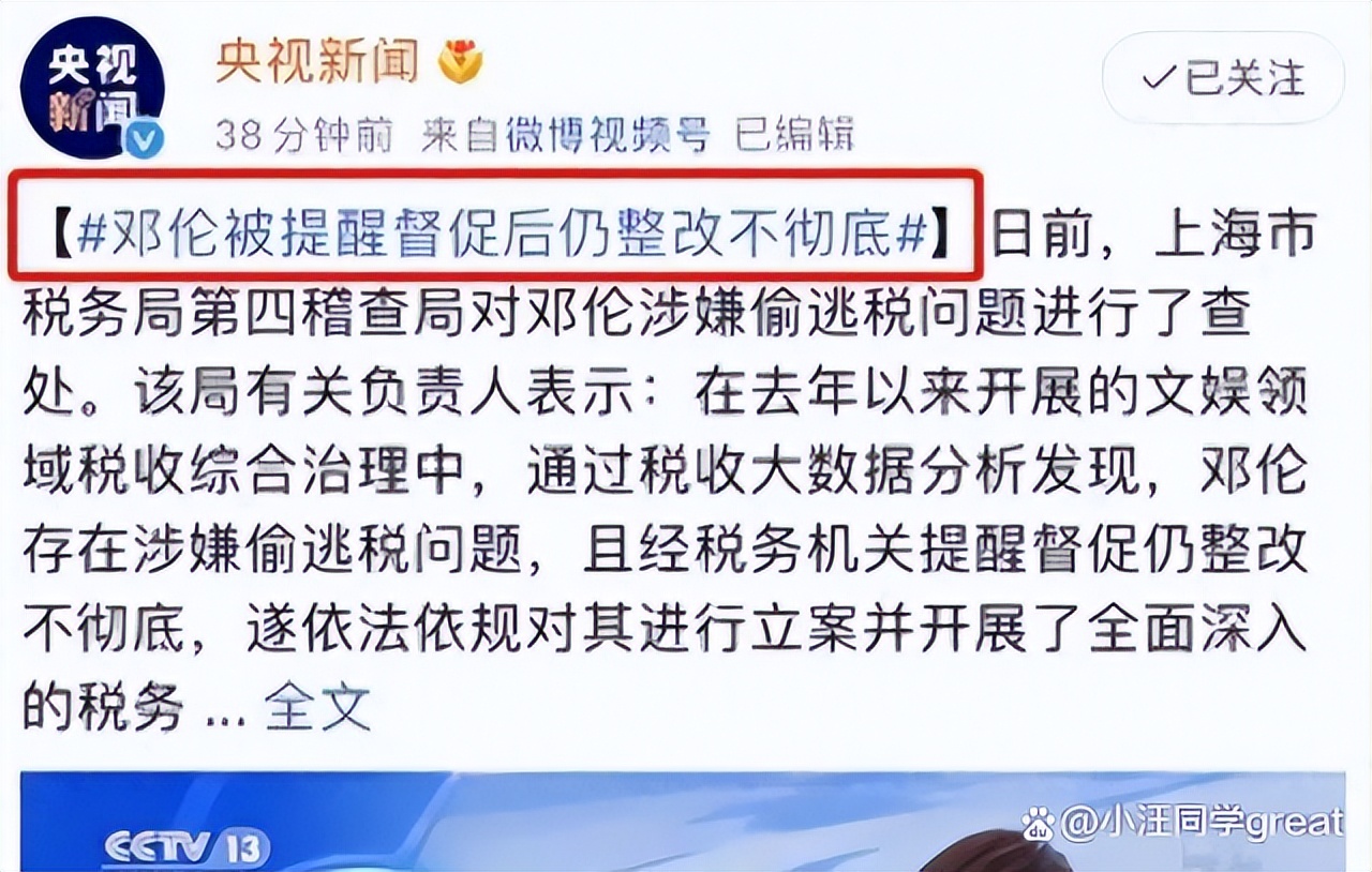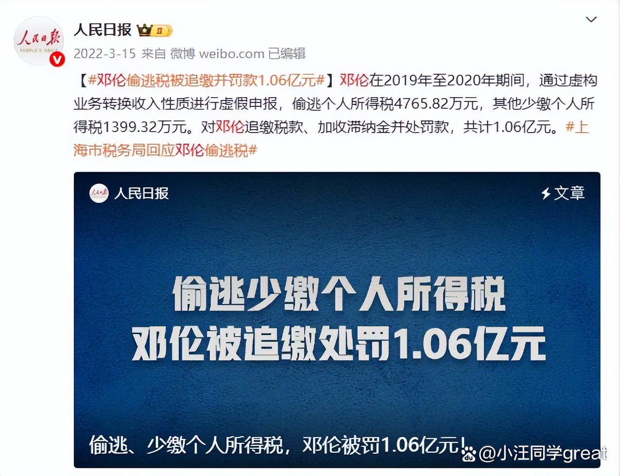 在范冰冰、郑爽等前车之鉴下,邓伦却依然心存侥幸,依然选择偷税逃税。被相关部门发现后,他不仅没有及时补缴税款、诚恳认错,反而消极应对、拖延逃避。最终,他收到了官方通报与高达 1.06 亿元的天价罚单。
