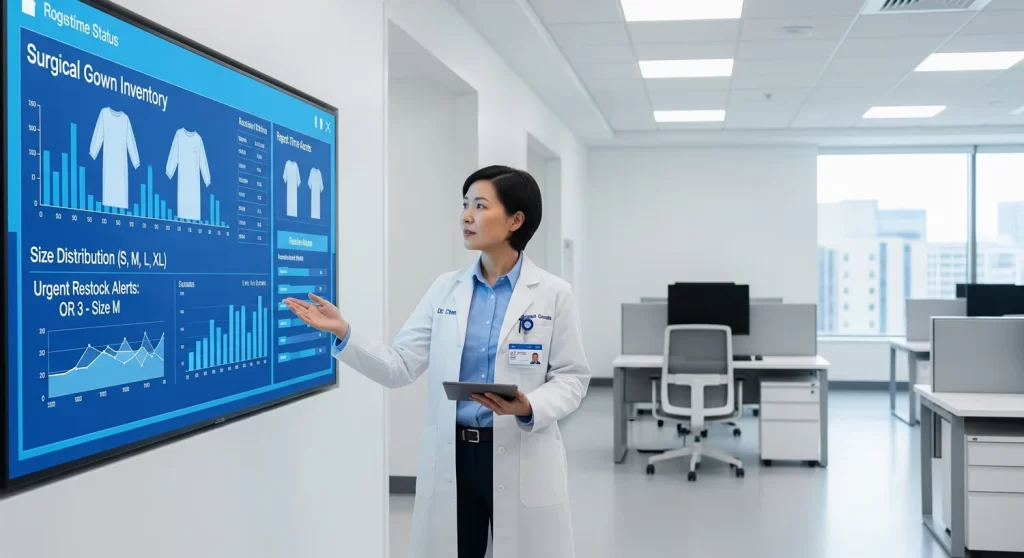 这意味着不再需要人工频繁巡查,也不用担心因为库存不足导致术前手术服短缺。除此之外,系统会记录每次领用数据,形成完整的日志,帮助医院精准掌握手术服的周转效率和使用趋势。哪些科室用量高?哪些时段需求集中?这些数据将成为优化资源配置的重要依据。