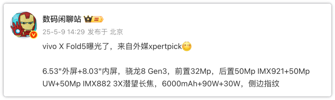 捋一捋,vivo X Fold5的卖点还挺硬核:超薄机身、6000mAh大电池、全焦段影像,配上OriginOS对多生态的兼容性,据说价格还惊喜多多!喜欢折叠屏的朋友,可以留意6月的新机发布会!