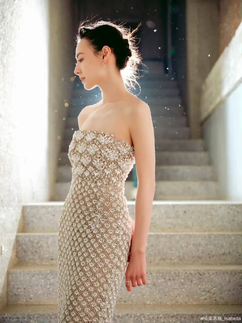 当日,梁洛施选择了一条简约而不失设计感的珍珠抹胸长裙亮相,贴身剪裁完美勾勒出她纤细的腰身和优越的肩颈比例,抹胸设计将锁骨与直角肩展露无遗,搭配利落的盘发和钻石耳饰,整体造型简约大气又高级,气质这一块真的没得挑剔。