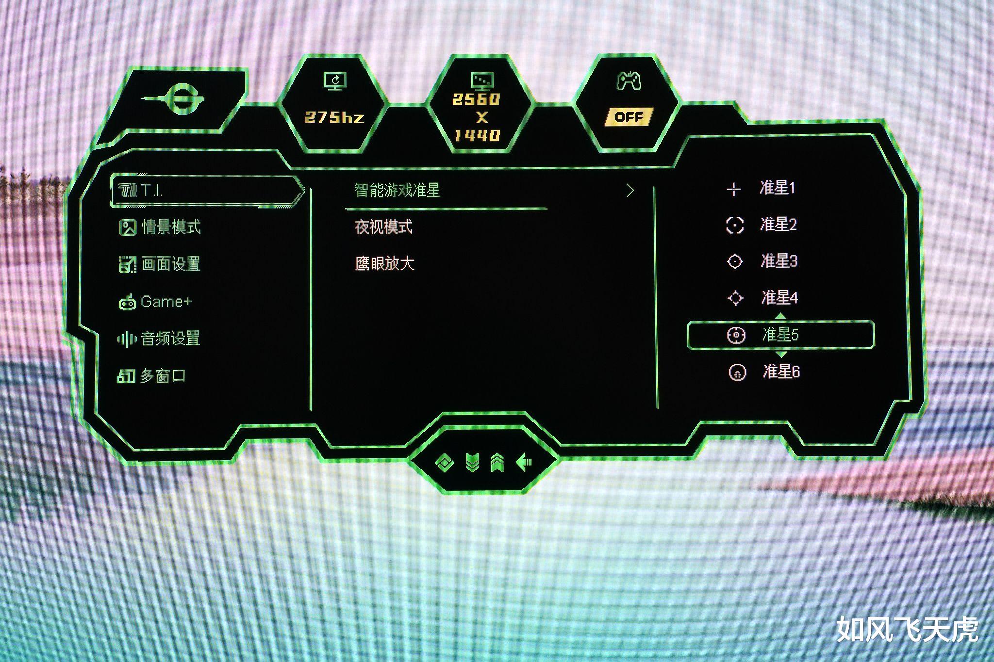 这款显示器支持准星辅助,同时可以选择准星的颜色,以及不同的准星样式,从而可以准确的知道弹着点,在FPS游戏里可以说是必不可少的功能。
